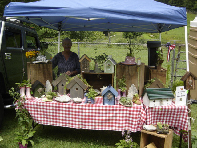 Joyce Brewster selling handmade bird houses and bird baths